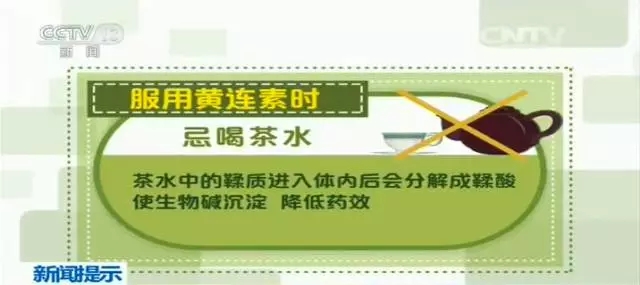 服用黄连素时忌喝茶水,因为茶水中的鞣质进入体内后会分解成鞣酸,使生物碱沉淀,降低药效。