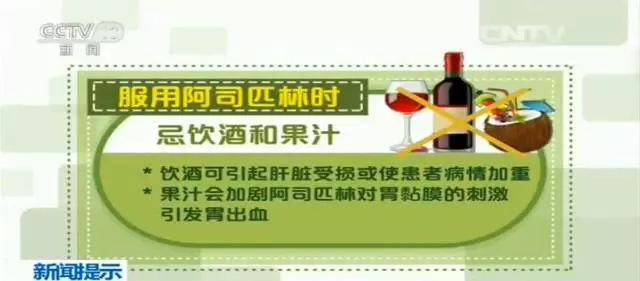 服用阿司匹林时忌饮酒和果汁,饮酒可引起肝脏受损或使患者病情加重,果汁会加剧阿司匹林对胃黏膜的刺激,引发胃出血。