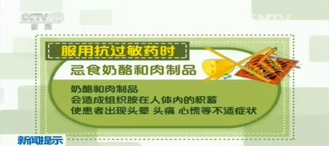 服用抗过敏药时忌食奶酪和肉制品,因为奶酪和肉制品会造成组织胺在人体内的积蓄,使患者出现头晕、头痛、心慌等不适症状。